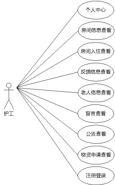 图3.7即为护工用例图,护工权限操作的功能包括查看老人信息,查看反馈信息,查看留言信息,查看公告等。