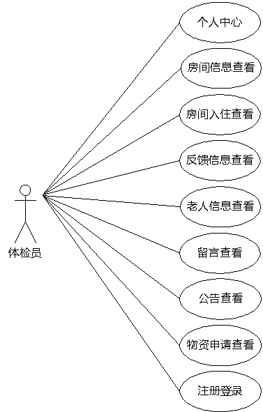 图3.8即为体检员用例图,体检员权限操作的功能包括查看物资申请信息,查看老人信息,查看房间入住信息等。