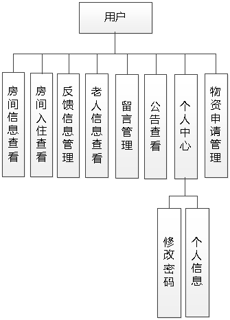 图4.5即为设计的用户功能结构,用户权限操作的功能包括管理留言,管理反馈信息,管理物资申请信息,查看老人信息等。