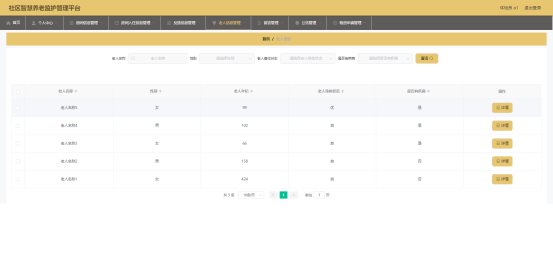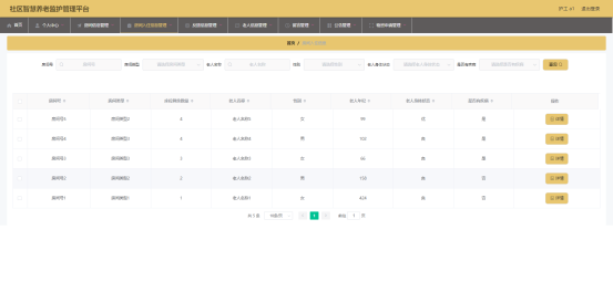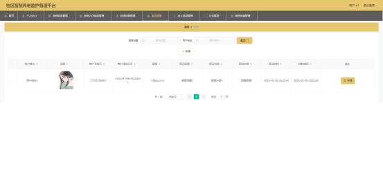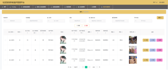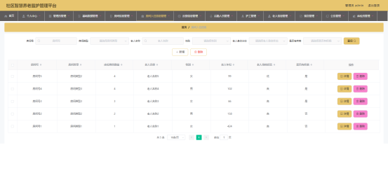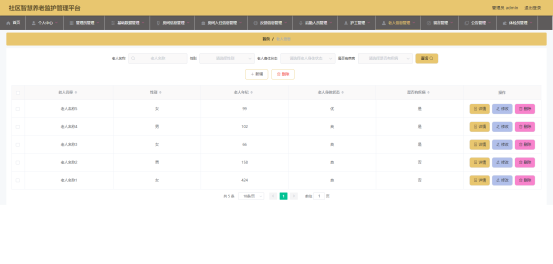 图5.3 即为编码实现的老人信息管理界面,管理员在该界面中对老人的信息进行新增,包括老人身体状态,老人年纪等信息,可以修改老人信息,查询老人信息等。
