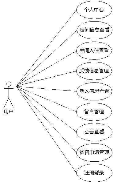 图3.9即为用户用例图,用户权限操作的功能包括管理留言,管理反馈信息,管理物资申请信息,查看老人信息等。