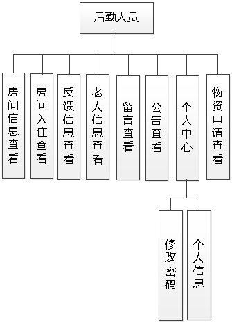 图4.2即为设计的后勤人员功能结构,后勤人员权限操作的功能包括查看房间,查看房间入住的老人,查看反馈信息,查看物资申请信息等。