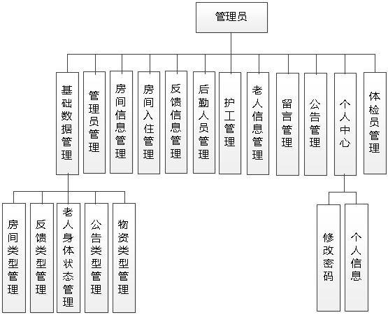 图4.1即为设计的管理员功能结构,管理员权限操作的功能包括对后勤人员,体检员,护工,老人,房间信息,房间入住信息,反馈信息以及留言等信息的管理。