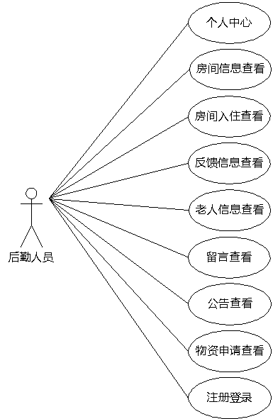 图3.6即为后勤人员用例图,后勤人员权限操作的功能包括查看房间,查看房间入住的老人,查看反馈信息,查看物资申请信息等。