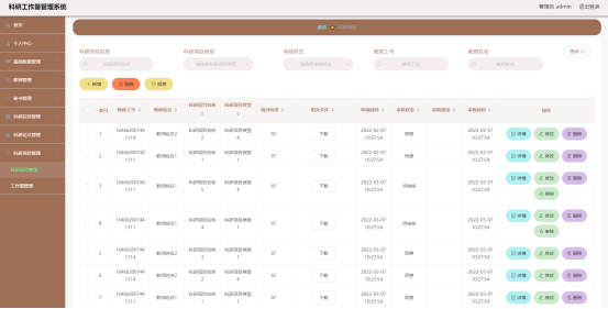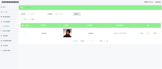 如图5.1显示的就是科研项目列表页面,此页面提供给管理员的功能有:查看科研项目、新增科研项目、修改科研项目、删除科研项目等。