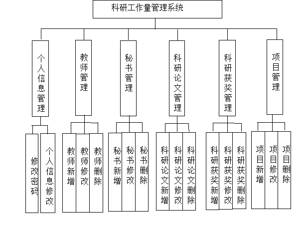 在分析并得出使用者对程序的功能要求时,就可以进行程序设计了。如图4.2展示的就是管理员功能结构图,管理员在后台主要管理字典管理、工作量管理、科研获奖管理、科研论文管理、秘书管理、科研项目管理、教师管理、管理员管理等。