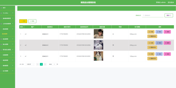 此页面让管理员管理患者的数据,患者管理页面见下图。此页面主要实现患者的增加、修改、删除、查看的功能。