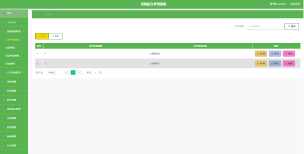 公告类型管理页面显示所有公告类型,在此页面既可以让管理员添加新的公告信息类型,也能对已有的公告类型信息执行编辑更新,失效的公告类型信息也能让管理员快速删除。下图就是公告类型管理页面。