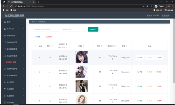 如图5.3显示的就是家庭医生管理页面,此页面提供给管理员的功能有:根据家庭医生进行条件查询,还可以对家庭医生进行新增、修改、查询操作等等。