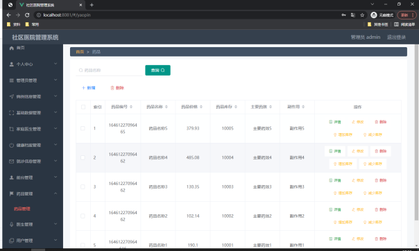 如图5.4显示的就是药品信息管理页面,此页面提供给管理员的功能有:根据药品信息进行新增、修改、查询操作等等。
