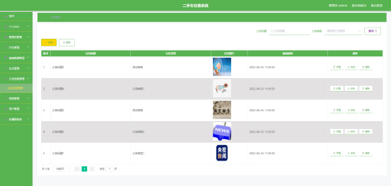 图5.2 即为编码实现的公告信息管理界面,公告信息包括公告内容,图片等信息。管理可以使用修改功能对登记有误的公告信息进行修改,可以删除需要删除的公告信息等。
