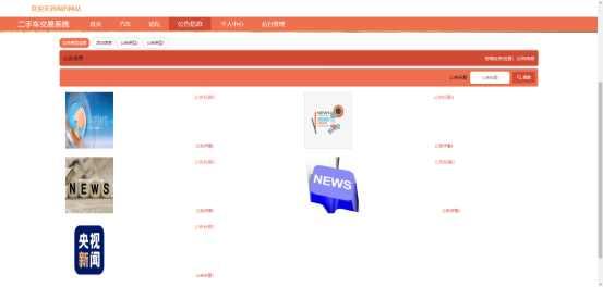 图5.9 即为编码实现的公告信息界面,用户在查询框中编辑公告标题即可实现对公告信息的查询,用户可以查看公告信息界面展示的任意一条公告信息。
