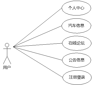图3.7即为用户用例图,用户权限操作的功能包括收藏汽车,发布关于汽车的留言,查看汽车的介绍信息,通过论坛进行信息讨论与交流,查看公告等。