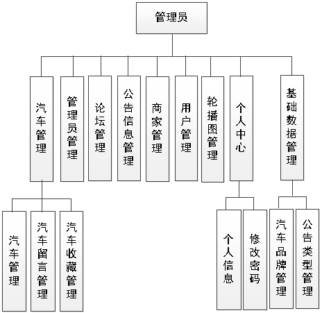 图4.1即为设计的管理员功能结构,管理员权限操作的功能包括增删改查商家,用户,公告,管理论坛信息,管理汽车和汽车留言以及汽车收藏信息等。