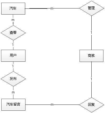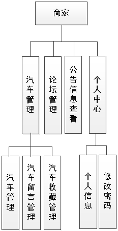 图4.2即为设计的商家功能结构,商家权限操作的功能包括新增汽车,上架汽车,下架汽车,回复汽车留言,管理汽车收藏,管理论坛信息。