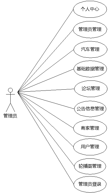 图3.5即为管理员用例图,管理员权限操作的功能包括增删改查商家,用户,公告,管理论坛信息,管理汽车和汽车留言以及汽车收藏信息等。
