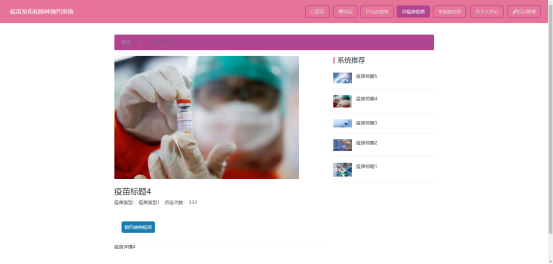 用户点击导航栏的疫苗信息链接就进入疫苗信息界面。疫苗信息界面如图5.8所示。本功能允许用户对系统推荐的疫苗信息进行查看,以及对疫苗进行预约接种。