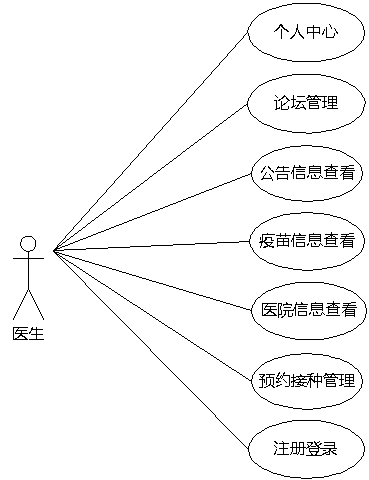 医生需要审核用户提交的预约接种信息,查看医院信息,公告信息以及疫苗信息。对医生的功能进行分析之后,将使用图3.5的医生用例图来描述医生的功能。