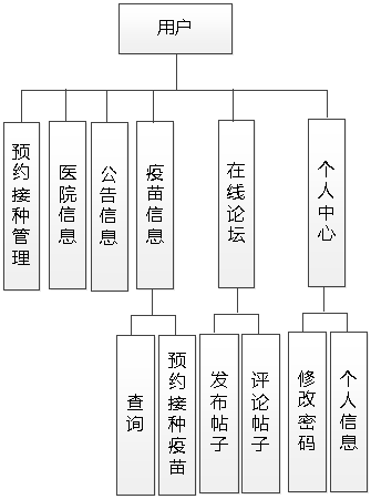 本小节运用功能结构图来描述用户具备的详细的功能,对用户的功能结构图绘制结果如图4.3所示。用户查看疫苗信息,查看医院信息,提交预约接种信息,查看公告等。