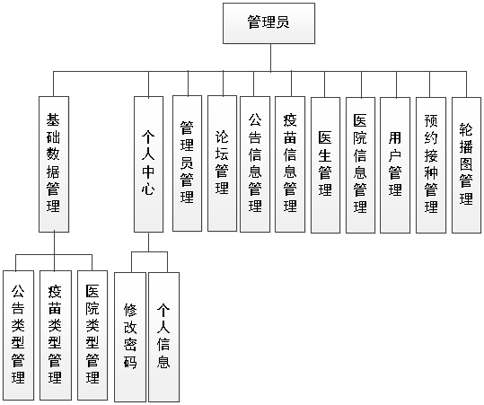 本小节运用功能结构图来描述管理员具备的详细的功能,对管理员的功能结构图绘制结果如图4.1所示。管理员对公告信息,医院信息,疫苗信息,医生信息,用户信息,论坛帖子信息以及预约接种信息等信息进行管理。