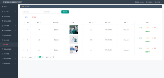 管理员点击导航栏的医生管理链接就进入医生管理界面。医生管理界面如图5.3所示。本功能允许管理员修改医生头像,修改医生姓名等信息,删除需要删除的医生信息。