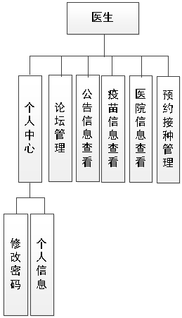 本小节运用功能结构图来描述医生具备的详细的功能,对医生的功能结构图绘制结果如图4.2所示。医生需要审核用户提交的预约接种信息,查看医院信息,公告信息以及疫苗信息。