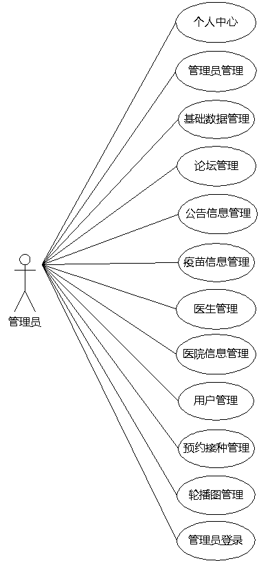 管理员对公告信息,医院信息,疫苗信息,医生信息,用户信息,论坛帖子信息以及预约接种信息等信息进行管理。对管理员的功能进行分析之后,将使用图3.4的管理员用例图来描述管理员的功能。