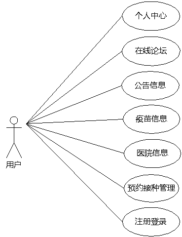 用户查看疫苗信息,查看医院信息,提交预约接种信息,查看公告等。对用户的功能进行分析之后,将使用图3.6的用户用例图来描述用户的功能。