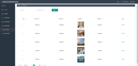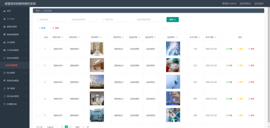 管理员点击导航栏的医院信息管理链接就进入医院信息管理界面。医院信息管理界面如图5.2所示。本功能允许管理员修改医院图片,医院地址等信息,删除需要删除的医院信息等。