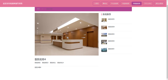 医生点击导航栏的医院信息查看链接就进入医院信息查看界面。医院信息查看界面如图5.6所示。本功能允许医生查询医院信息,查看医院地址,医院图片等信息。