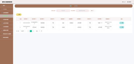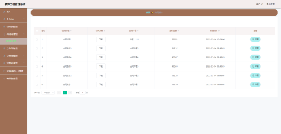 图5.7 即为编码实现的合同信息管理界面,员工新增项目合同信息,下载项目文件,下载合同文件,查看合同详细信息等。