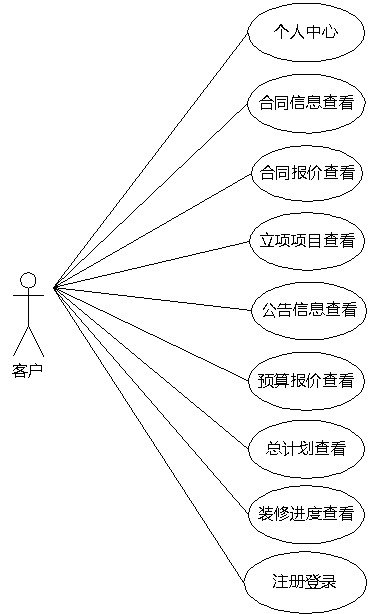 图3.7即为客户用例图,客户权限操作的功能包括查看合同报价,查看合同信息,查看立项项目,查看预算报价,查看装修进度,查看公告信息等。