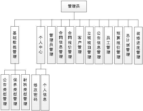 图4.1即为设计的管理员功能结构,管理员权限操作的功能包括管理合同信息,管理合同报价,管理立项项目,管理预算报价,管理装修进度,管理员工,管理客户等信息。