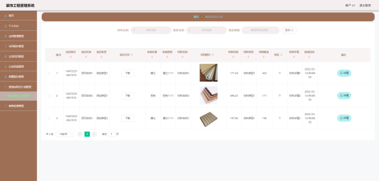 图5.10 即为编码实现的装饰材料总计划查看界面,客户查看材料价格,材料图片,采购数量,材料详情,材料名称等信息,可以查看装饰材料总计划详情信息,同时可以根据材料名称或项目名称来查询装饰材料总计划信息等。