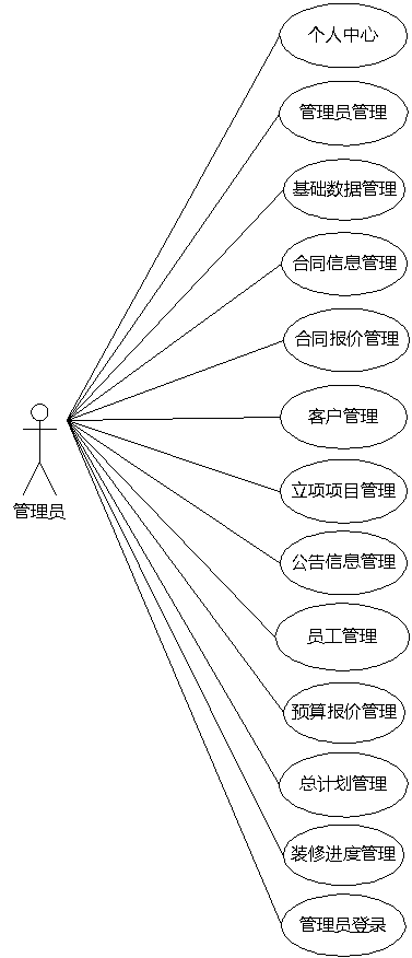 图3.5即为管理员用例图,管理员权限操作的功能包括管理合同信息,管理合同报价,管理立项项目,管理预算报价,管理装修进度,管理员工,管理客户等信息。