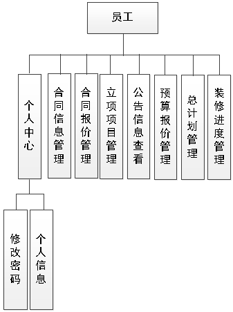 图4.2即为设计的员工功能结构,员工权限操作的功能包括对合同信息,合同报价信息,立项项目信息,预算报价信息,装饰材料总计划信息,装修进度信息等进行新增并管理。