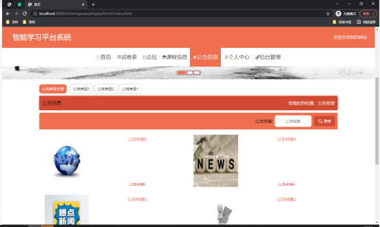 如图5.4显示的就是公告信息管理页面,此页面提供给管理员的功能有:根据公告信息进行新增、修改、查询操作等等。