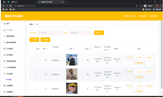 如图5.1显示的就是学生信息管理页面,此页面提供给管理员的功能有:学生信息的查询管理,可以删除学生信息、修改学生信息、新增学生信息,