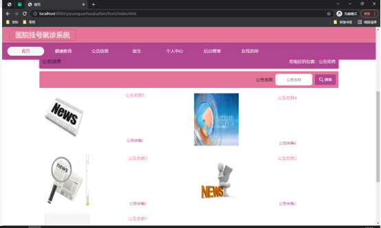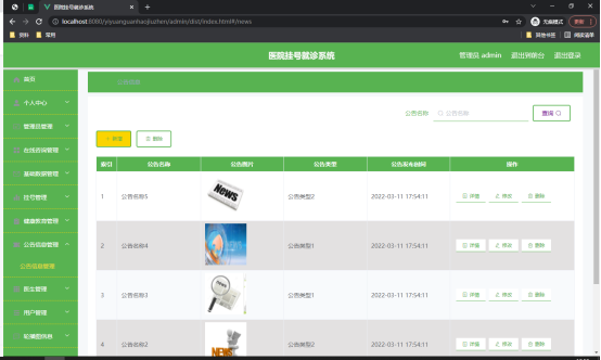如图5.4显示的就是公告信息管理页面,此页面提供给管理员的功能有:根据公告信息进行新增、修改、查询操作等等。
