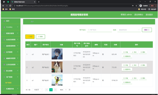 如图5.1显示的就是用户信息管理页面,此页面提供给管理员的功能有:用户信息的查询管理,可以删除用户信息、修改用户信息、新增用户信息,