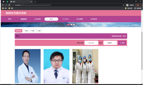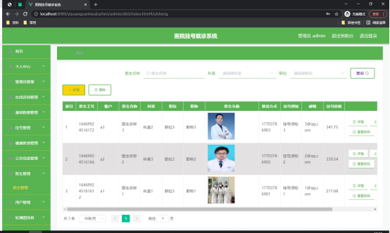 如图5.2显示的就是医生信息管理页面,此页面提供给管理员的功能有:查看已发布的医生信息数据,修改医生信息,医生信息作废,即可删除,还进行了对医生信息名称的模糊查询 医生信息信息的类型查询等等一些条件。