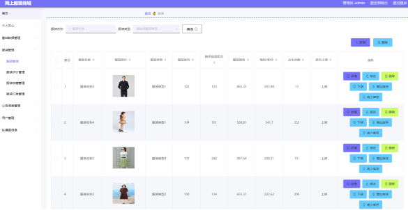 如图5.1显示的就是服装列表页面,此页面提供给管理员的功能有:查看服装、新增服装、修改服装、删除服装等。