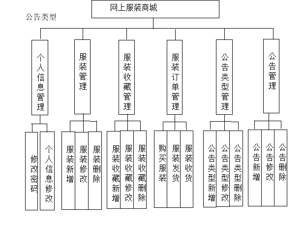 网上服装商城系统在进行系统中功能模块的划分时,采用层次图来进行表示。层次图具有树形结构,它能使用矩形框来描绘数据信息。顶层代表的数据结构很完整,顶层下面的矩形框表示的数据就是子集数据,当然处于最下面的矩形框就是不能再进行细分的数据元素了,使用层次方框图描述系统功能能让用户一目了然,能够明白系统的功能,以及对应功能板块下面的子功能都可以清楚领会。网上服装商城分为管理员和用户两部分操作角色,下面将对他们的功能进行阐述。