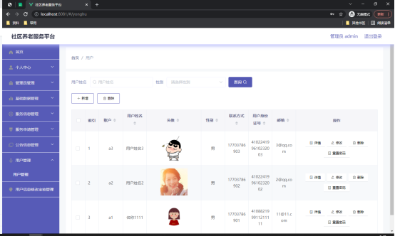 如图5.1显示的就是用户信息管理页面,此页面提供给管理员的功能有:用户信息的查询管理,可以删除用户信息、修改用户信息、新增用户信息,