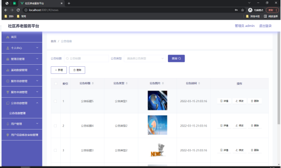 如图5.4显示的就是公告信息管理页面,此页面提供给管理员的功能有:根据公告信息进行新增、修改、查询操作等等。