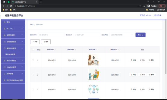 如图5.2显示的就是服务信息管理页面,此页面提供给管理员的功能有:查看已发布的服务信息数据,修改服务信息,服务信息作废,即可删除,还进行了对服务信息名称的模糊查询 服务信息信息的类型查询等等一些条件。