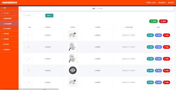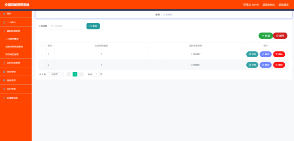 公告类型管理页面显示所有公告类型,在此页面既可以让管理员添加新的公告信息类型,也能对已有的公告类型信息执行编辑更新,失效的公告类型信息也能让管理员快速删除。下图就是公告类型管理页面。