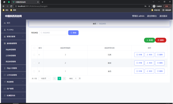 如图5.3显示的就是商品类型管理页面,此页面提供给管理员的功能有:根据商品类型进行条件查询,还可以对商品类型进行新增、修改、查询操作等等。