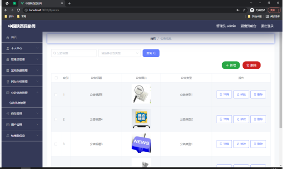 如图5.4显示的就是公告信息管理页面,此页面提供给管理员的功能有:根据公告信息进行新增、修改、查询操作等等。