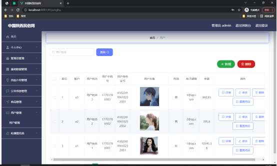 如图5.1显示的就是用户信息管理页面,此页面提供给管理员的功能有:用户信息的查询管理,可以删除用户信息、修改用户信息、新增用户信息,